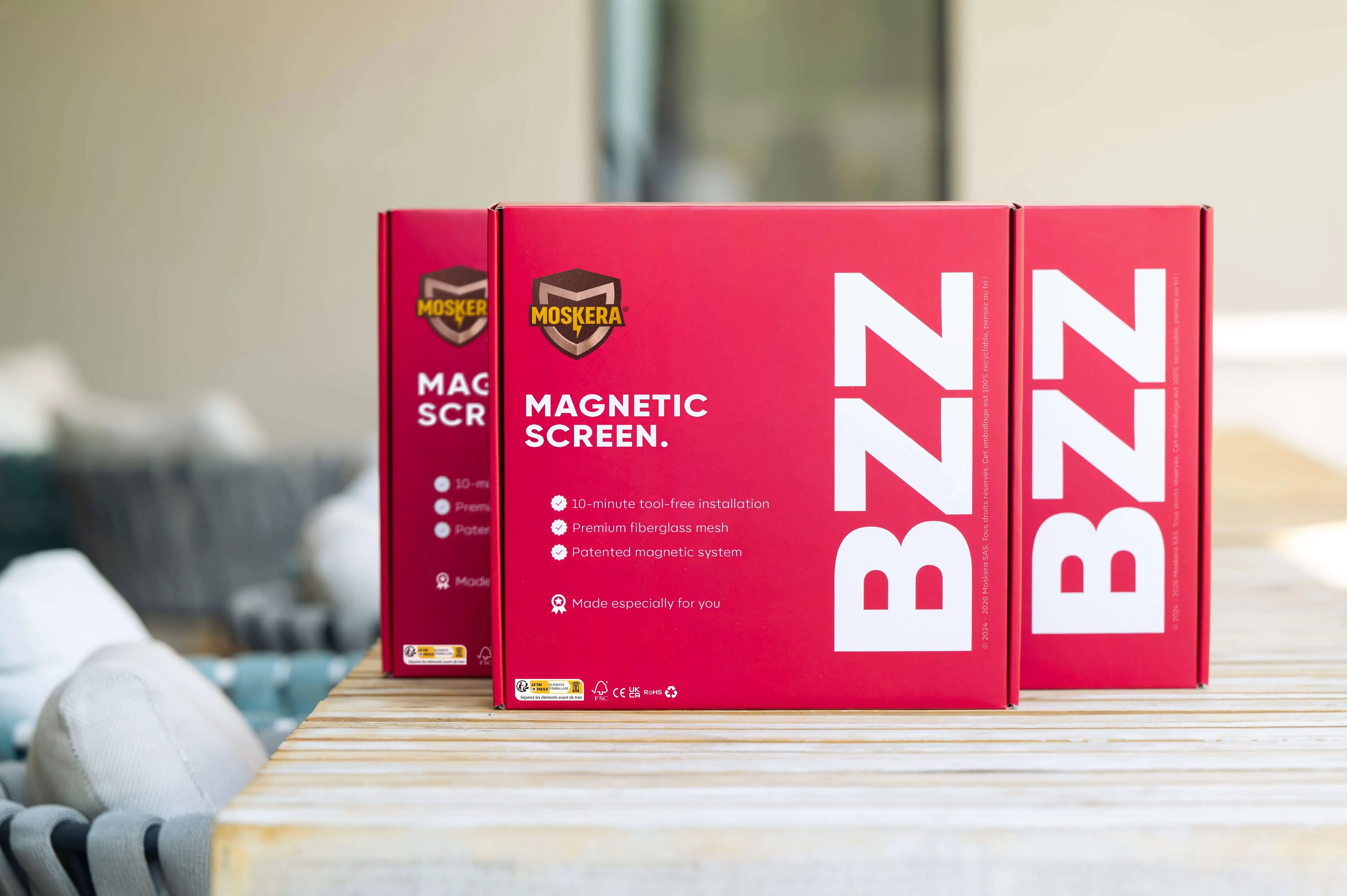 Attach and align the Moskill mosquito screen, Velcro to Velcro. Check positioning and adjust if necessary. Enjoy your screen and a bug-free summer!